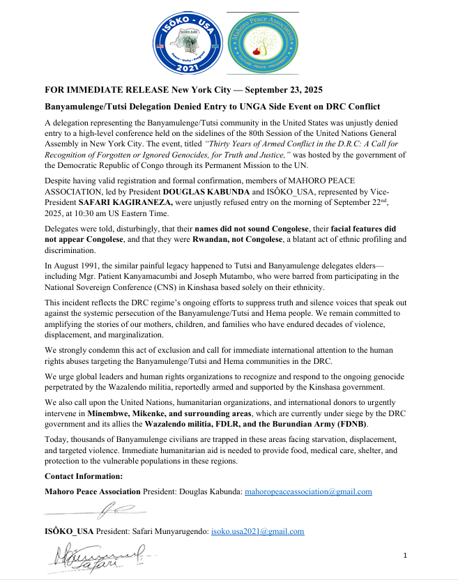 New York City, September 23, 2025 — A delegation representing the Banyamulenge/Tutsi community in the United States was denied entry to a high-level conference on the Democratic Republic of Congo (DRC), raising alarms of ethnic discrimination at an event hosted during the 80th Session of the United Nations General Assembly (UNGA).