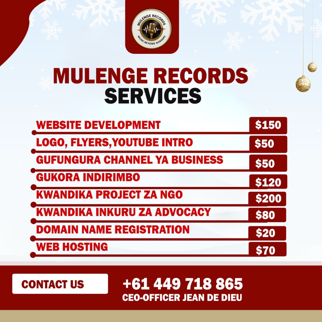 Founded and owned by CEO-OFFICER Jean de Dieu, Mulenge Records operates in partnership with Afrovera Media Agency, combining artistic production with media expertise and professional communication. According to the founder, the studio is designed to support artists, community leaders, and organizations seeking both creative expression and sustainable impact.