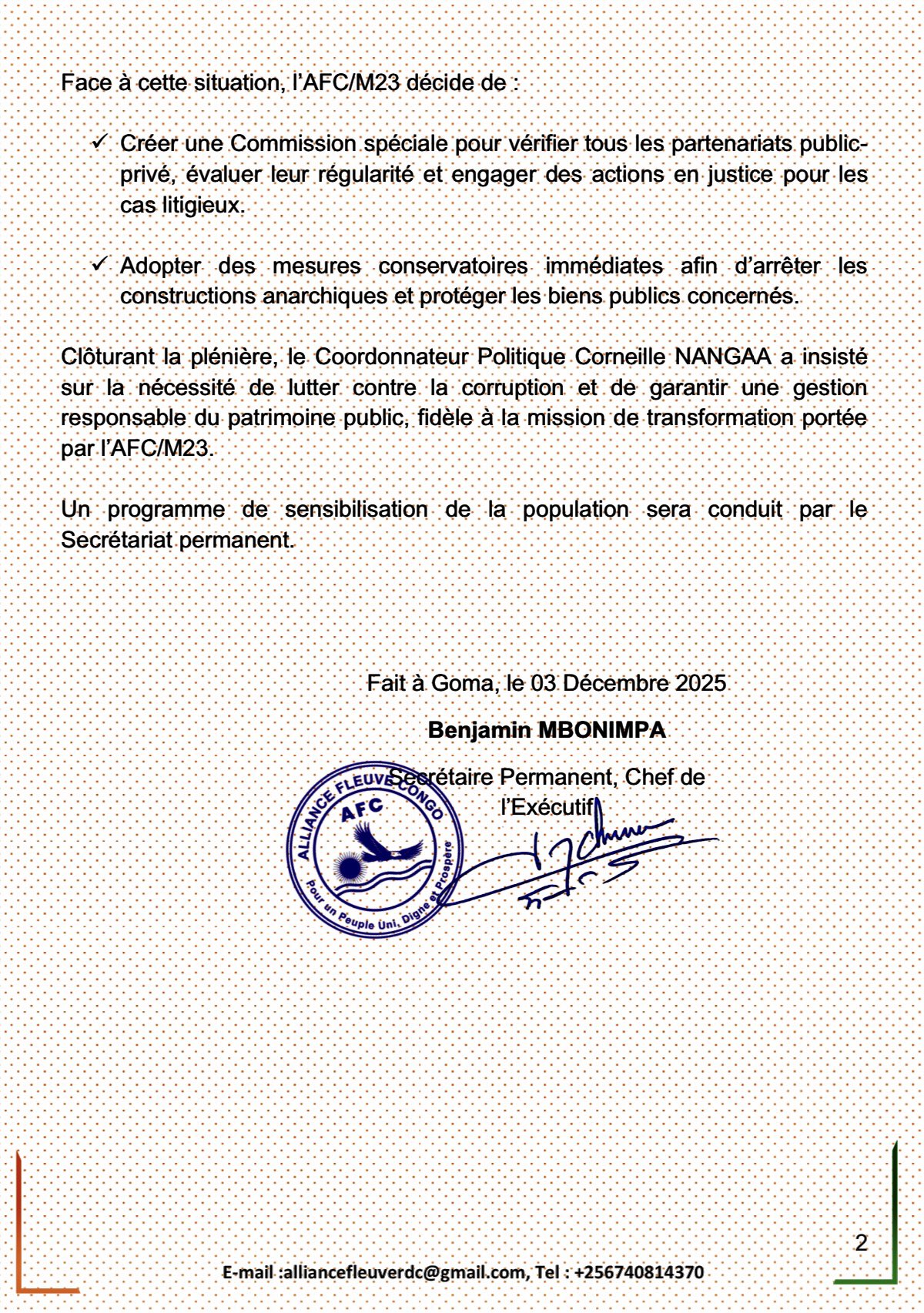 Face à la gravité de ces révélations, l’AFC/M23 a annoncé une série de mesures urgentes. Le mouvement prévoit la création d’une Commission spéciale chargée de vérifier l’ensemble des partenariats public-privé, d’évaluer leur régularité et d’engager des actions judiciaires dans tous les dossiers litigieux. Par ailleurs, des mesures conservatoires immédiates seront appliquées afin de stopper les constructions anarchiques et de protéger les biens concernés contre toute nouvelle tentative de spoliation.