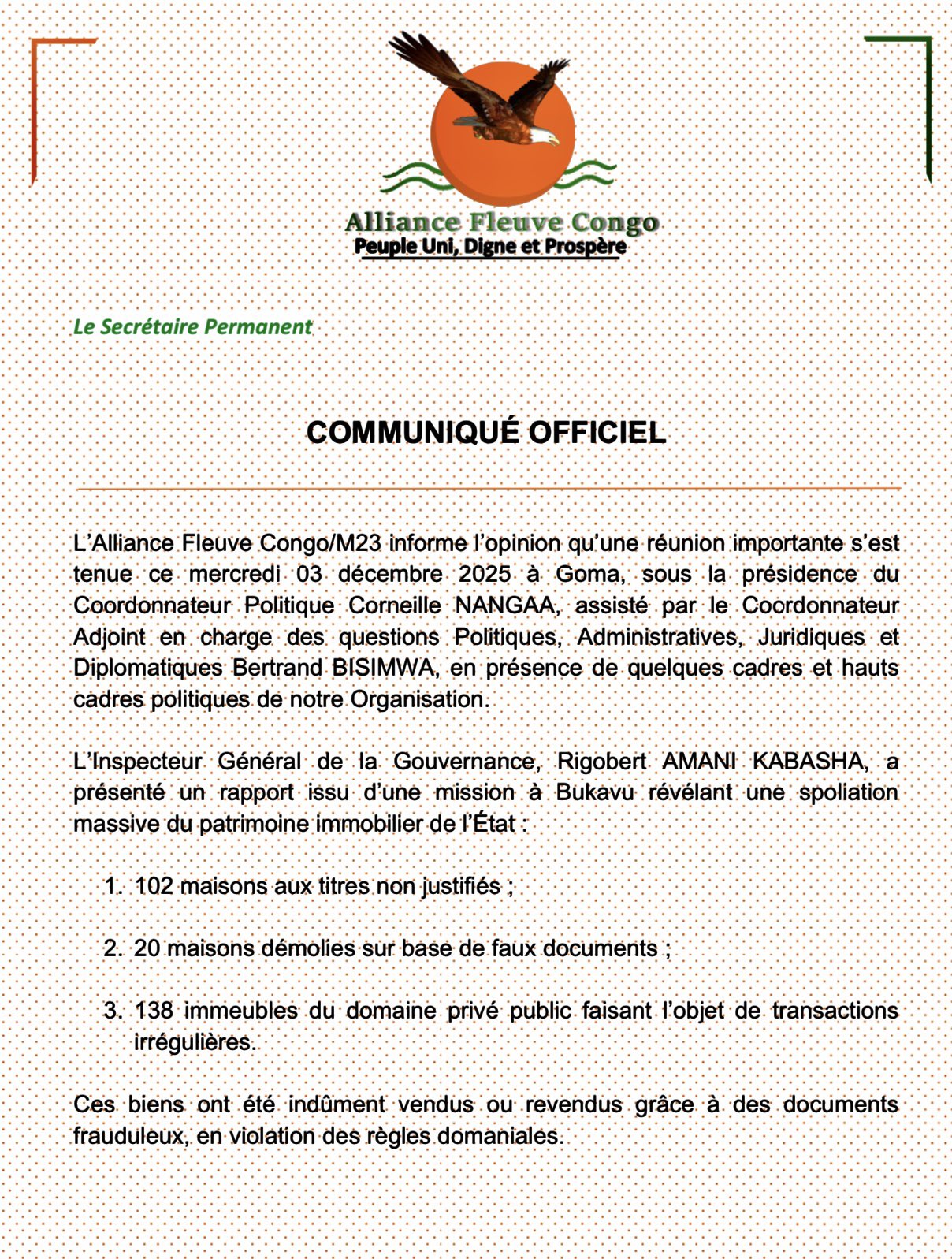 En dépit des attaques multiformes menées par les forces coalisées du régime de Kinshasa sur l’ensemble des lignes de front ainsi que contre les populations civiles, la hiérarchie de l’Alliance Fleuve Congo/M23 (AFC/M23) a tenu, le mercredi 03 décembre 2025 à Goma, une importante plénière consacrée à l’examen du rapport de l’Inspection Générale de la Gouvernance (IGG) relatif à la spoliation systématique du patrimoine immobilier de l’État à Bukavu, dans la province du Sud-Kivu.