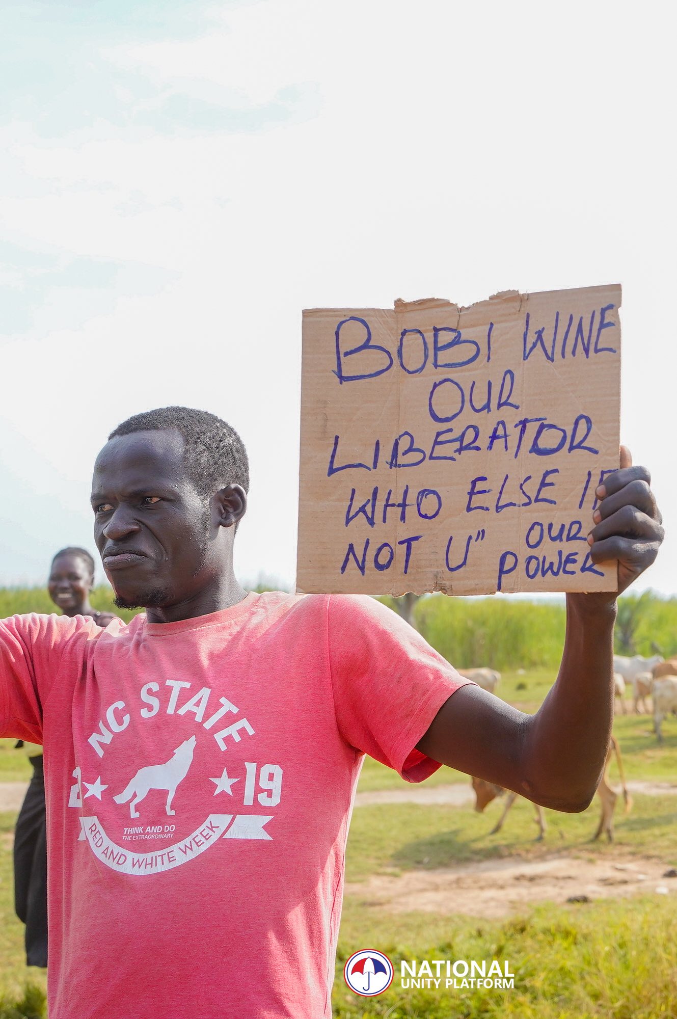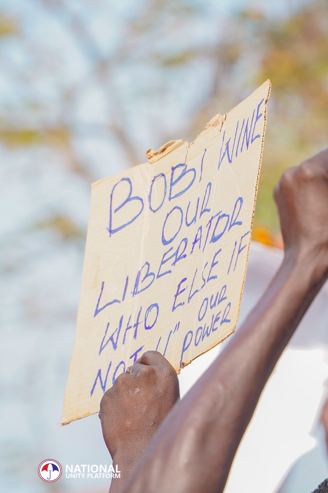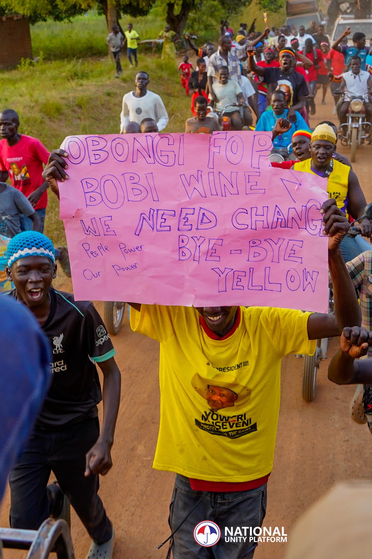 Many of those gathering are ordinary citizens: young men in dusty football jerseys, women carrying infants on their backs, elderly villagers wrapped in colorful gomesis, and teenagers running alongside pickup trucks with unrestrained enthusiasm. Their placards, written on torn cardboard and notebook sheets, tell a story that is raw and unfiltered. One man raises a sign reading, “If Traoré can lead Burkina Faso, why not our Bobi?” Another elderly woman waves the Ugandan flag as she shouts, “People Power, Our Power!” A young man on a dirt road holds a cardboard message: “Bobi Wine our liberator, who else if not you?”