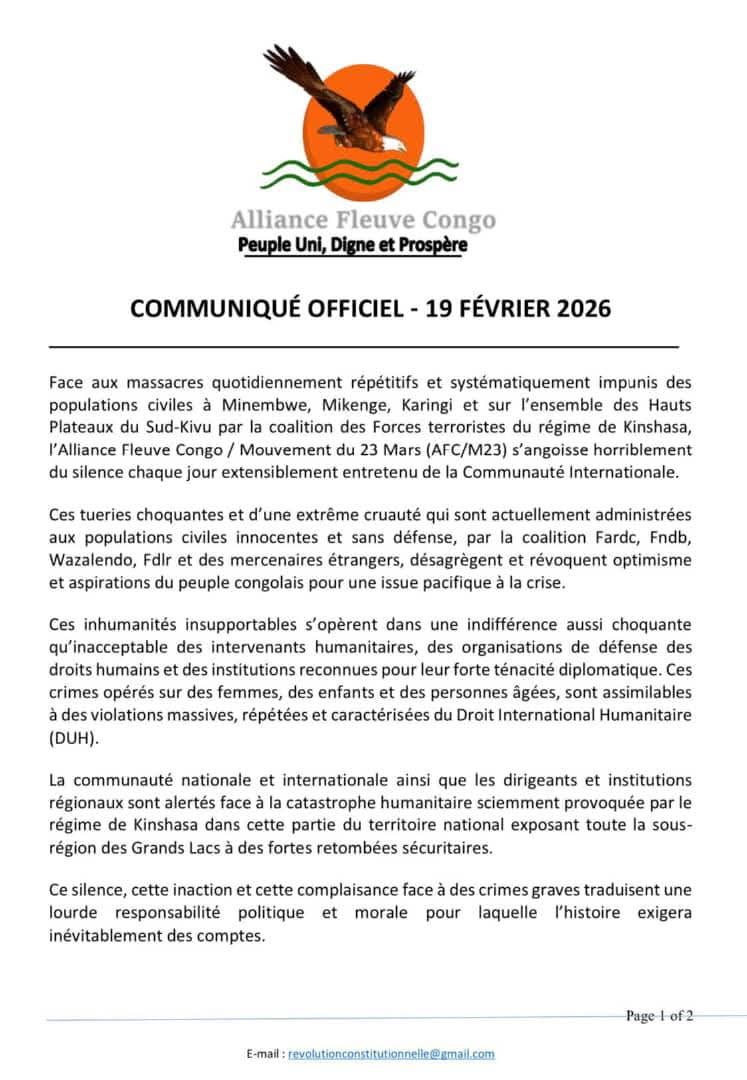 Ihuriro rya politiki n’igisirikare Alliance Fleuve Congo (AFC/M23) ryasohoye itangazo ryihutirwa rivuga ko rifite impungenge zikomeye ku mutekano muke ukomeje gufata intera mu bice bya Minembwe, Mikenge na Karingi muri Kivu y’Amajyepfo.