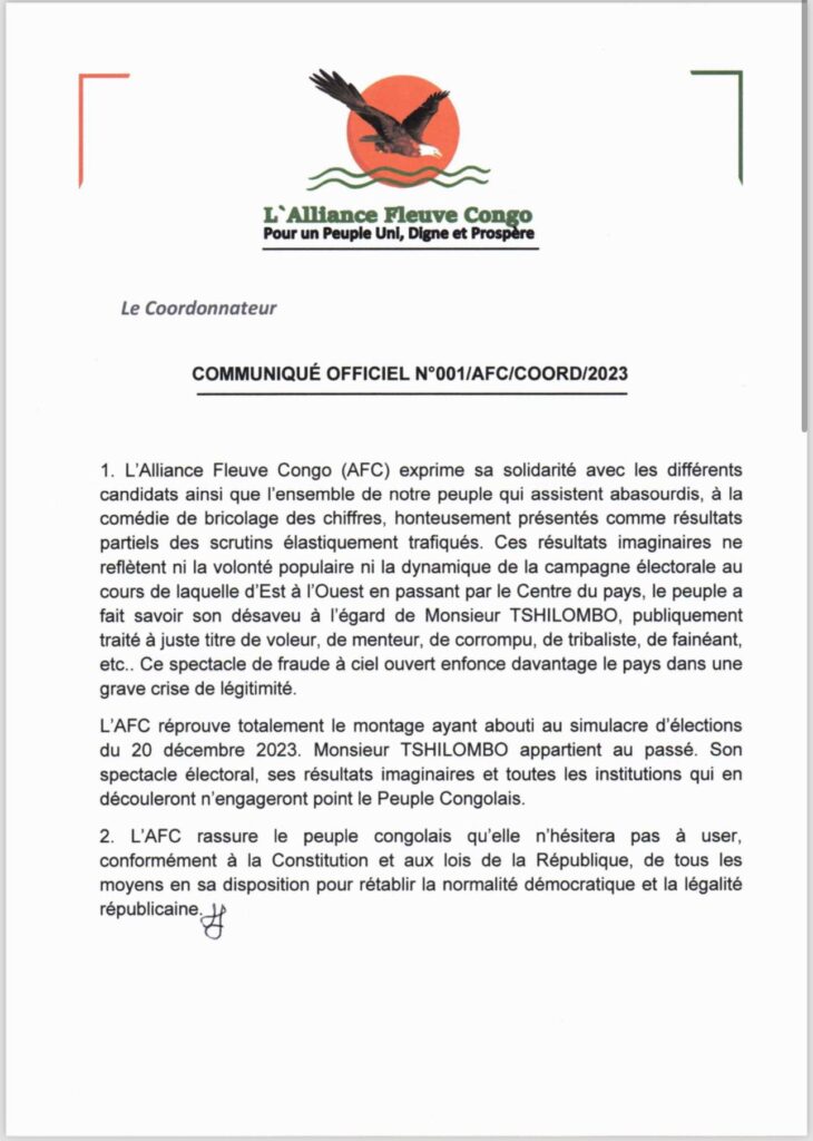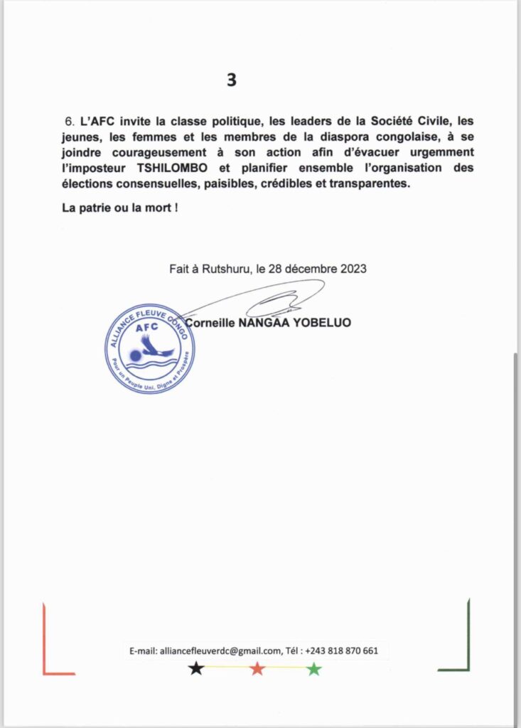Iri kandi ni tangazo rya mbere Nangaa, ashyizeho umukono agaragaza ko ari muri RDC. Itangazo yashyizeho umukono riravuga ko AFC irahamagarira, imitwe ya politike yose ikorera k’u butaka bwa RDC, za Sosiyete sivile, urubyiruko, abagore ndetse n’Abanyekongo bose bari mu mahanga, gushishikara, mu bikorwa bigamije gushiraho iherezo ubutegetsi, bwa perezida Félix Tshisekedi.