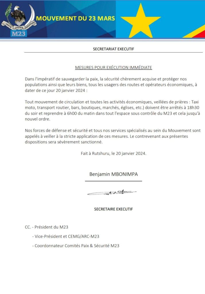 Iri tangazo rikomeza rivuga ko “Gusubukura ibi bikorwa ni saa kumi n’ebyiri zuzuye za mugitondo (6:00Am), aya ni amabwiriza mashya ya M23.”