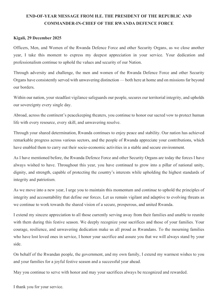 Perezida wa Repubulika y’u Rwanda akaba n’Umugaba w’Ikirenga w’Ingabo, Paul Kagame, yashimiye byimazeyo Ingabo z’u Rwanda (RDF) n’inzego z’umutekano ku muhate, ubwitange n’ubunyamwuga byaranze ibikorwa byazo mu mwaka wa 2025, byagize uruhare runini mu kubungabunga umutekano n’ubusugire bw’igihugu, bigaha Abanyarwanda amahirwe yo kwiteza imbere batekanye.